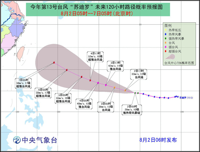 展望:8月6日后,“苏迪罗”将以每小时15-20公里的速度继续向西偏北方向移动,逐渐向台湾东部海域靠近,并将于8月8日前后影响我国东南沿海。(西联集团——诺言)